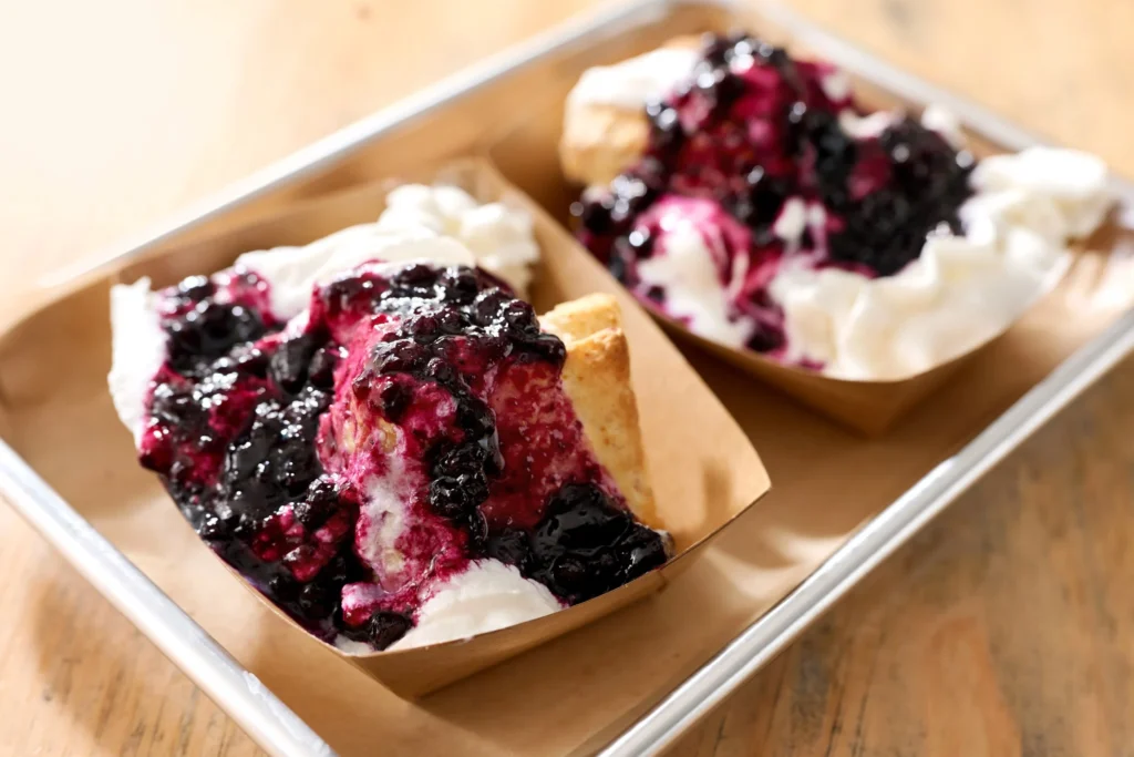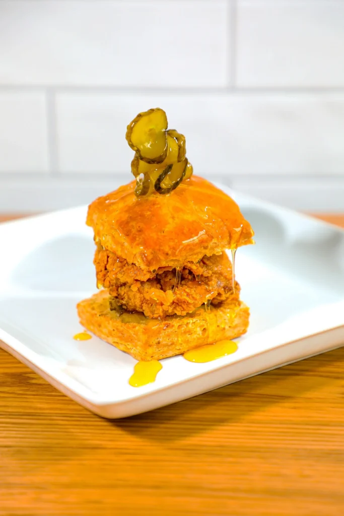 The chicken is the star. Birds are dry brined with powdered vinegar before frying, giving you acid flavor built into the meat without heavy breading. Lighter, crispier, and built for repeat visits. Standout sandwiches include The OG Bumble with black pepper ranch slaw, pickles, and cheese, and the Blue and Buffalo layered with creamy blue cheese and spicy buffalo sauce. Sides, biscuits, pimento cheese boards, and Duck Camp doughnuts round it all out.