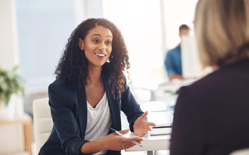 Interview with a happy, excited and confident human resources manager talking to a shortlist candidate for a job.